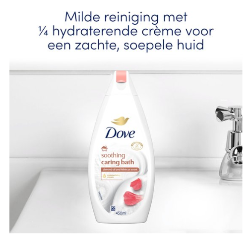 Dove Soothing Caring Bath Amandelolie & Hibiscus Badcrème is verrijkt met 1/4 hydraterende crème en zorgt in bad voor een zachte, soepele en schone huid.