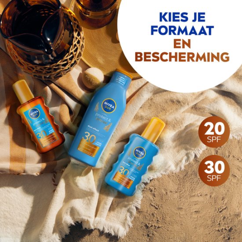 NIVEA SUN Protect & Bronze Olie Spray SPF20 200ml biedt een dubbele werking: onmiddellijke UVA/UVB-bescherming voor je huid en een mooie en egale bruine kleur dankzij het pro-melanine extract dat het huideigen melanine stimuleert. De formule van deze zonnebrand trekt snel in, zorgt voor een glad en zacht huidgevoel, is waterbestendig en bevat geen zelfbruiner. NIVEA SUN Protect & Bronze Olie Spray SPF20 is voor 91% biologisch afbreekbaar en respecteert de oceaan door vrij te zijn van UV-filters Octinoxate, Oxybenzone en Octocrylene. Huidvriendelijkheid dermatologisch bewezen.