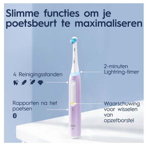 De iO 4 elektrische tandenborstel is voorzien van de beste technologie van Oral-B en combineert een door tandartsen geïnspireerde ronde borstelkop met micro-vibrerende borstelharen voor een professioneel reinigend gevoel thuis. De slimme poetsdruksensor zorgt dat dat u niet te hard of te zacht poetst om uw tandvlees beter te beschermen. Gum Guard waarschuwt u als u te veel druk op uw tanden uitoefent. Vervang de Oral-B iO opzetborstel elke 3 maanden voor de beste resultaten.
